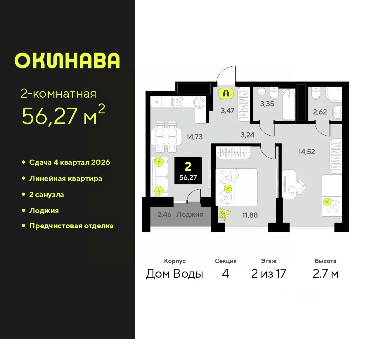Продается 2-комн. квартира от застройщика с предчистовой отделкой в ЖК "Окинава" на 2 этаже. Общая площадь: 56.27 кв.м., жилая: 26.4 кв.м., площадь просторной кухни-столовой: 14.73 кв.м. Комнаты изолированные, все окна выходят на одну сторону. В квартире одна лоджия, два совмещенных санузла. Высота потолков 2.7 м.