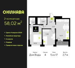 2-комн. квартира от застройщика с предчистовой отделкой в ЖК "Окинава" на 5 этаже. Общая площадь: 58.02 кв.м., жилая: 26.4 кв.м., площадь просторной кухни-столовой: 16.21 кв.м. Комнаты изолированные, все окна выходят на одну сторону. В квартире одна лоджия, два совмещенных санузла. Высота потолков 2.7 м.