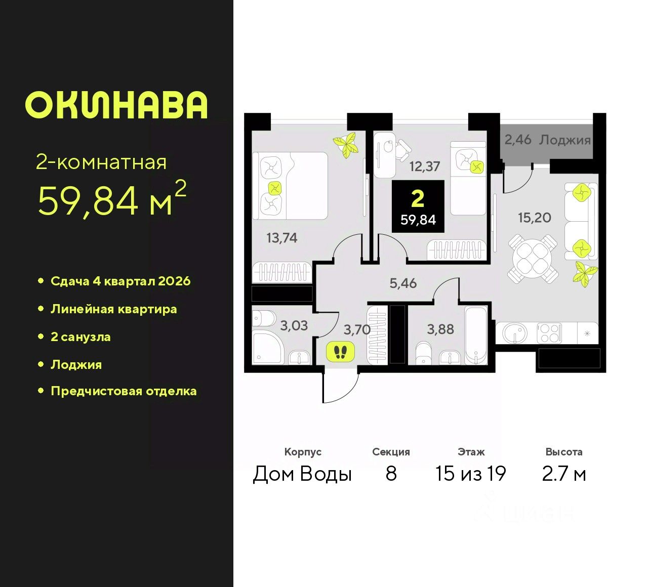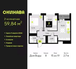Двухкомнатная квартира с предчистовой отделкой в ЖК "Окинава" на 15 этаже. Общая площадь: 59.84 кв.м., жилая: 26.11 кв.м., площадь просторной кухни-столовой: 15.2 кв.м. Комнаты изолированные, все окна выходят на одну сторону. В квартире одна лоджия, два совмещенных санузла. Высота потолков 2.7 м.