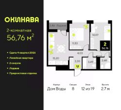 Продается двухкомнатная квартира с предчистовой отделкой в ЖК "Окинава" на 12 этаже. Общая площадь: 56.76 кв.м., жилая: 25.6 кв.м., площадь просторной кухни-столовой: 15.2 кв.м. Комнаты изолированные, все окна выходят на одну сторону. В квартире одна лоджия, два совмещенных санузла. Высота потолков 2.7 м.