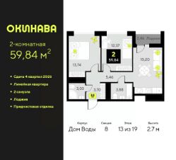 2-комн. квартира от застройщика с предчистовой отделкой в ЖК "Окинава" на 13 этаже. Общая площадь: 59.84 кв.м., жилая: 26.11 кв.м., площадь просторной кухни-столовой: 15.2 кв.м. Комнаты изолированные, все окна выходят на одну сторону. В квартире одна лоджия, два совмещенных санузла. Высота потолков 2.7 м.