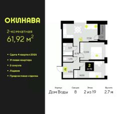 Продается 2-комн. квартира от застройщика с предчистовой отделкой в ЖК "Окинава" на 2 этаже. Общая площадь: 61.92 кв.м., жилая: 26.94 кв.м., площадь просторной кухни-столовой: 17.38 кв.м. Квартира угловая, идеально подойдет любителям тишины и панорамных видов. В квартире одна лоджия, один совмещенный и один раздельный санузел. Высота потолков 2.7 м.
