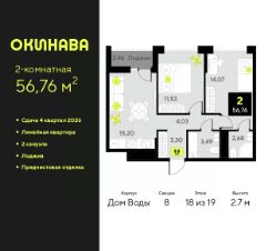 Продается двухкомнатная квартира с предчистовой отделкой в ЖК "Окинава" на 18 этаже. Общая площадь: 56.76 кв.м., жилая: 25.6 кв.м., площадь просторной кухни-столовой: 15.2 кв.м. Комнаты изолированные, все окна выходят на одну сторону. В квартире одна лоджия, два совмещенных санузла. Высота потолков 2.7 м.