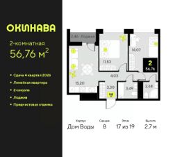 Просторная 2-комн. квартира с предчистовой отделкой в ЖК "Окинава" на 17 этаже. Общая площадь: 56.76 кв.м., жилая: 25.6 кв.м., площадь просторной кухни-столовой: 15.2 кв.м. Комнаты изолированные, все окна выходят на одну сторону. В квартире одна лоджия, два совмещенных санузла. Высота потолков 2.7 м.
