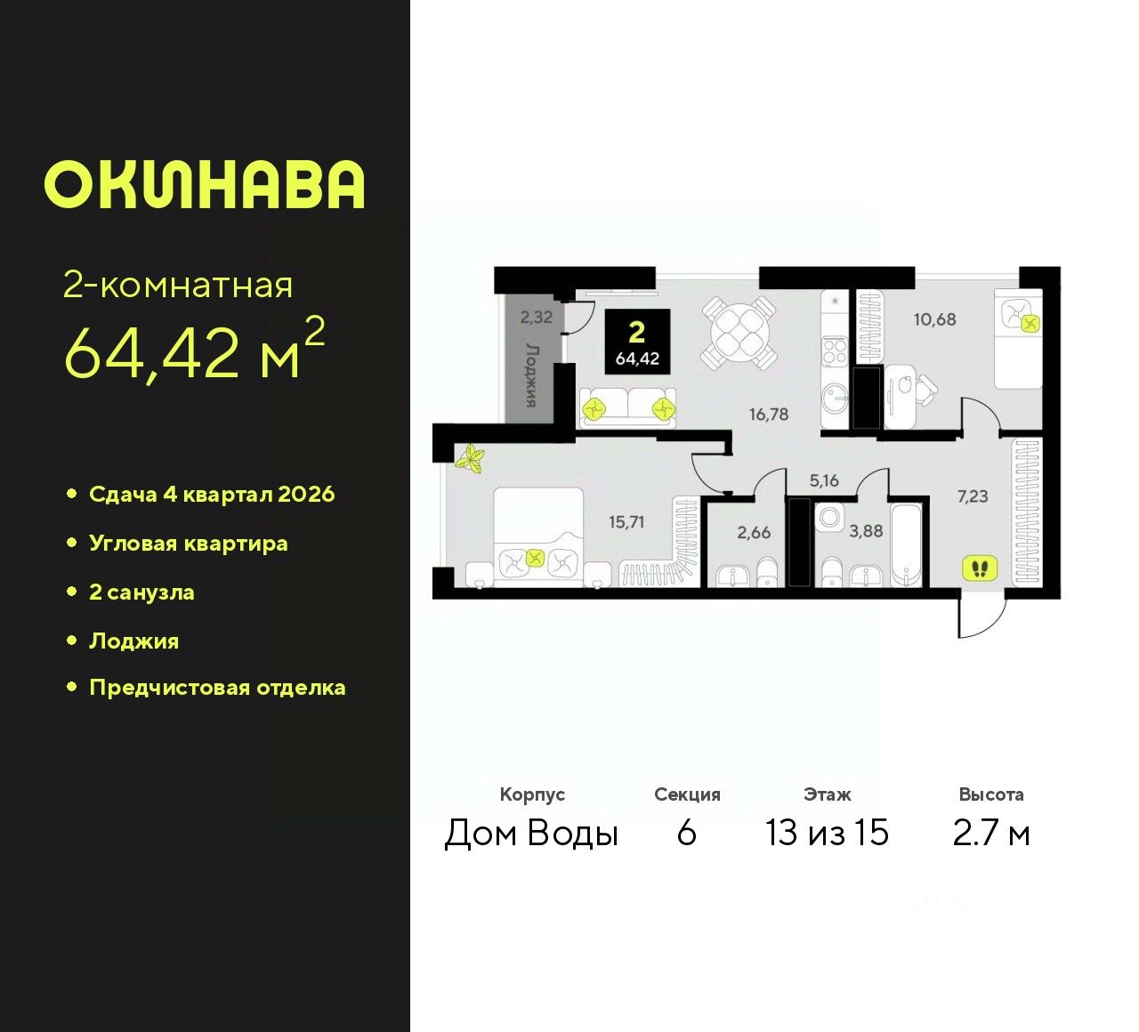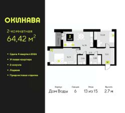 2-комн. квартира с предчистовой отделкой в ЖК "Окинава" на 13 этаже. Общая площадь: 64.42 кв.м., жилая: 26.39 кв.м., площадь просторной кухни-столовой: 16.78 кв.м. Квартира угловая, очень светлая, естественная вентиляция при открытии окон. В квартире одна лоджия, один совмещенный и один раздельный санузел. Высота потолков 2.7 м.