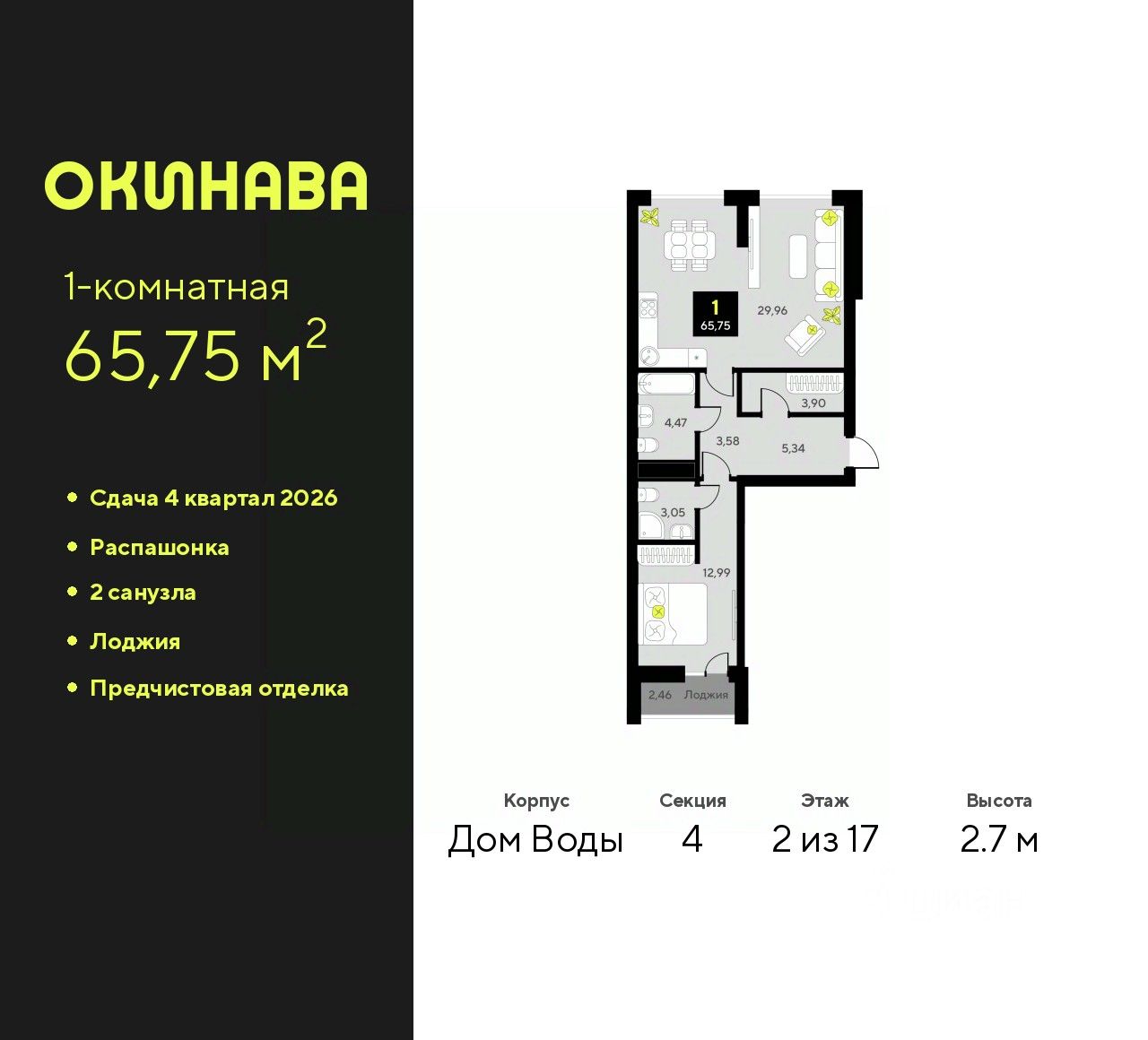 Продается однокомнатная квартира с предчистовой отделкой в ЖК "Окинава" на 2 этаже. Общая площадь: 65.75 кв.м., жилая: 12.99 кв.м., площадь просторной кухни-столовой: 29.96 кв.м. Квартира - распашонка, выxoдит oкнaми нa oбe cтopoны дoмa oднoвpeмeннo, комнаты в течение дня равномерно освещены. В квартире одна лоджия, два совмещенных санузла. Высота потолков 2.7 м.