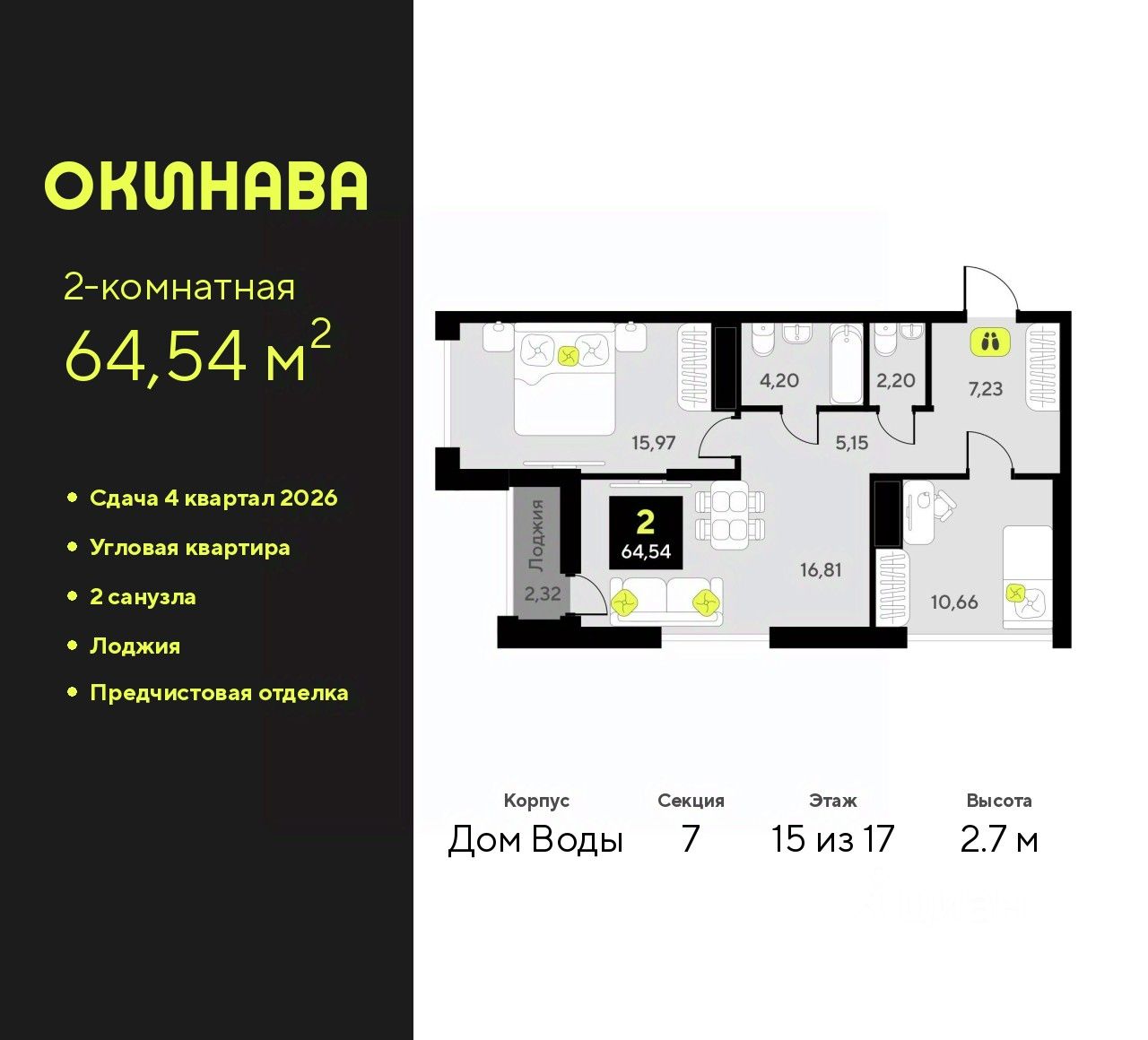 2-комн. квартира от застройщика с предчистовой отделкой в ЖК "Окинава" на 15 этаже. Общая площадь: 64.54 кв.м., жилая: 26.63 кв.м., площадь просторной кухни-столовой: 16.81 кв.м. Квартира угловая, окна oбecпeчивaют paвнoмepнoe ocвeщeниe в тeчeниe дня. В квартире одна лоджия, один совмещенный и один раздельный санузел. Высота потолков 2.7 м.
