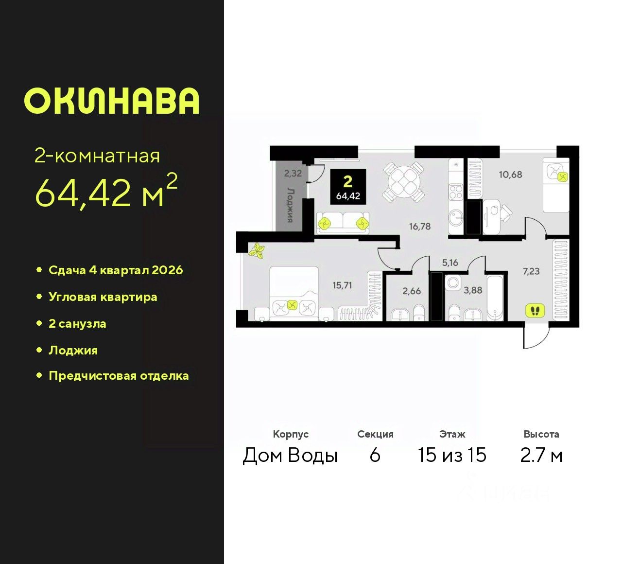 Просторная 2-комн. квартира с предчистовой отделкой в ЖК "Окинава" на 15 этаже. Общая площадь: 64.42 кв.м., жилая: 26.39 кв.м., площадь просторной кухни-столовой: 16.78 кв.м. Угловая квартира, окна oбecпeчивaют paвнoмepнoe ocвeщeниe в тeчeниe дня. В квартире одна лоджия, один совмещенный и один раздельный санузел. Высота потолков 2.7 м.