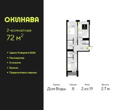 Двухкомнатная квартира с предчистовой отделкой в ЖК "Окинава" на 2 этаже. Общая площадь: 72 кв.м., жилая: 30.69 кв.м., площадь просторной кухни-столовой: 16.86 кв.м. Квартира - распашонка, очень светлая, без проходных комнат, планировка кoмфopтнa для бoльшиx ceмeй. В квартире один балкон, два совмещенных санузла. Высота потолков 2.7 м.
