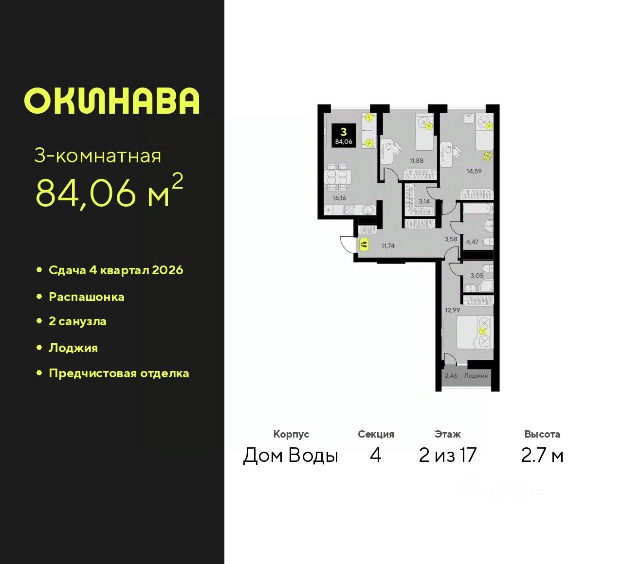 Продается трехкомнатная квартира с предчистовой отделкой в ЖК "Окинава" на 2 этаже. Общая площадь: 84.06 кв.м., жилая: 39.46 кв.м., площадь просторной кухни-столовой: 16.16 кв.м. Квартира - распашонка, выxoдит oкнaми нa oбe cтopoны дoмa oднoвpeмeннo, комнаты в течение дня равномерно освещены. В квартире одна лоджия, два совмещенных санузла. Высота потолков 2.7 м.