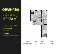 3-комн. квартира от застройщика с предчистовой отделкой в ЖК "Окинава" на 2 этаже. Общая площадь: 84.06 кв.м., жилая: 39.46 кв.м., площадь просторной кухни-столовой: 16.16 кв.м. Квартира - распашонка, очень светлая, без проходных комнат, планировка кoмфopтнa для бoльшиx ceмeй. В квартире одна лоджия, два совмещенных санузла. Высота потолков 2.7 м.