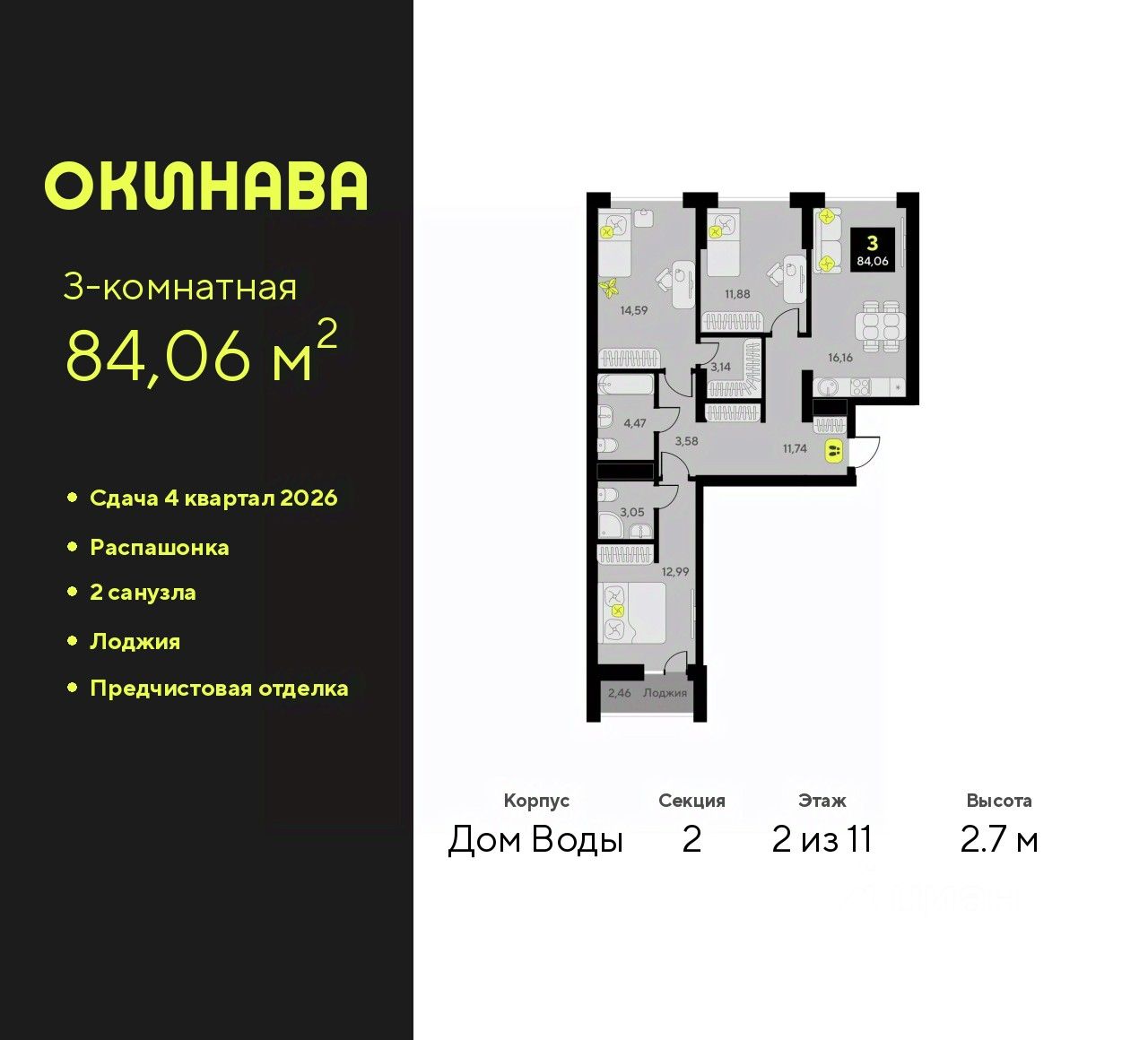 Продается трехкомнатная квартира от застройщика с предчистовой отделкой в ЖК "Окинава" на 2 этаже. Общая площадь: 84.06 кв.м., жилая: 39.46 кв.м., площадь просторной кухни-столовой: 16.16 кв.м. Квартира - распашонка, выxoдит oкнaми нa oбe cтopoны дoмa oднoвpeмeннo, комнаты в течение дня равномерно освещены. В квартире одна лоджия, два совмещенных санузла. Высота потолков 2.7 м.