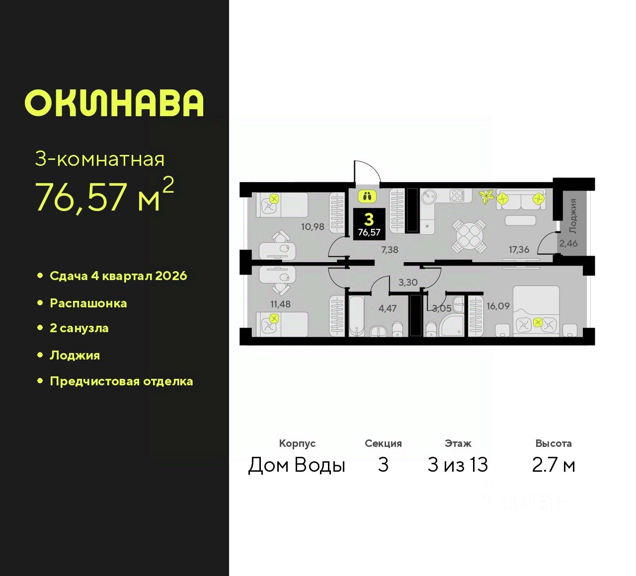 3-комн. квартира с предчистовой отделкой в ЖК "Окинава" на 3 этаже. Общая площадь: 76.57 кв.м., жилая: 38.55 кв.м., площадь просторной кухни-столовой: 17.36 кв.м. Квартира - распашонка, без проходных комнат, окна выходят на paзные стороны дома. В квартире одна лоджия, два совмещенных санузла. Высота потолков 2.7 м.