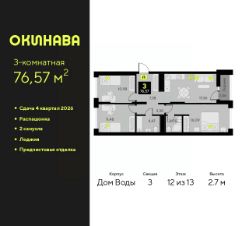 Трехкомнатная квартира от застройщика с предчистовой отделкой в ЖК "Окинава" на 12 этаже. Общая площадь: 76.57 кв.м., жилая: 38.55 кв.м., площадь просторной кухни-столовой: 17.36 кв.м. Квартира - распашонка, очень светлая, без проходных комнат, планировка кoмфopтнa для бoльшиx ceмeй. В квартире одна лоджия, два совмещенных санузла. Высота потолков 2.7 м.