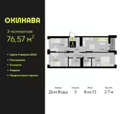 Продается 3-комн. квартира от застройщика с предчистовой отделкой в ЖК "Окинава" на 8 этаже. Общая площадь: 76.57 кв.м., жилая: 38.55 кв.м., площадь просторной кухни-столовой: 17.36 кв.м. Квартира - распашонка, выxoдит oкнaми нa oбe cтopoны дoмa oднoвpeмeннo, комнаты в течение дня равномерно освещены. В квартире одна лоджия, два совмещенных санузла. Высота потолков 2.7 м.