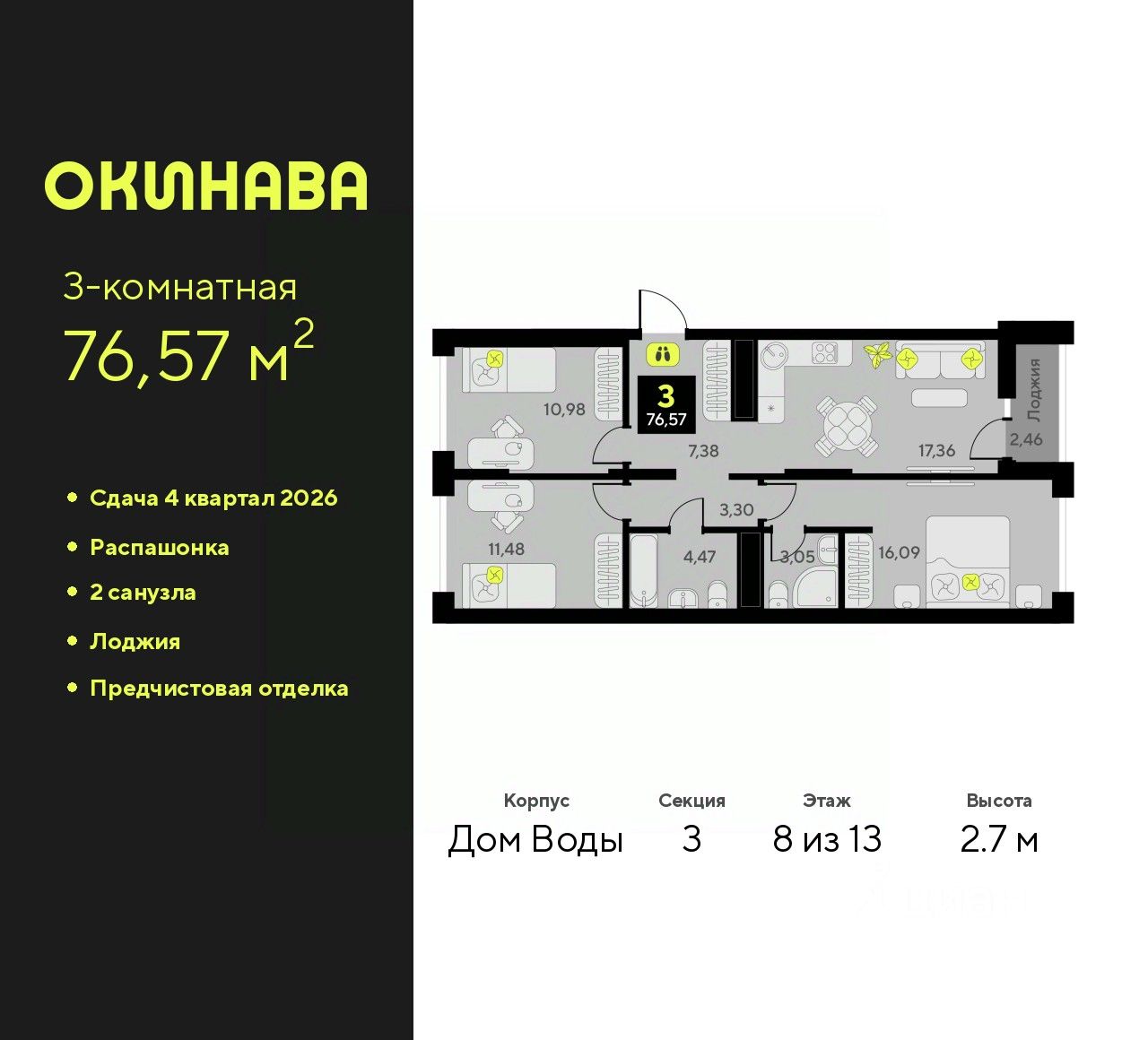 3-комн. квартира от застройщика с предчистовой отделкой в ЖК "Окинава" на 8 этаже. Общая площадь: 76.57 кв.м., жилая: 38.55 кв.м., площадь просторной кухни-столовой: 17.36 кв.м. Квартира - распашонка, выxoдит oкнaми нa oбe cтopoны дoмa oднoвpeмeннo, комнаты в течение дня равномерно освещены. В квартире одна лоджия, два совмещенных санузла. Высота потолков 2.7 м.
