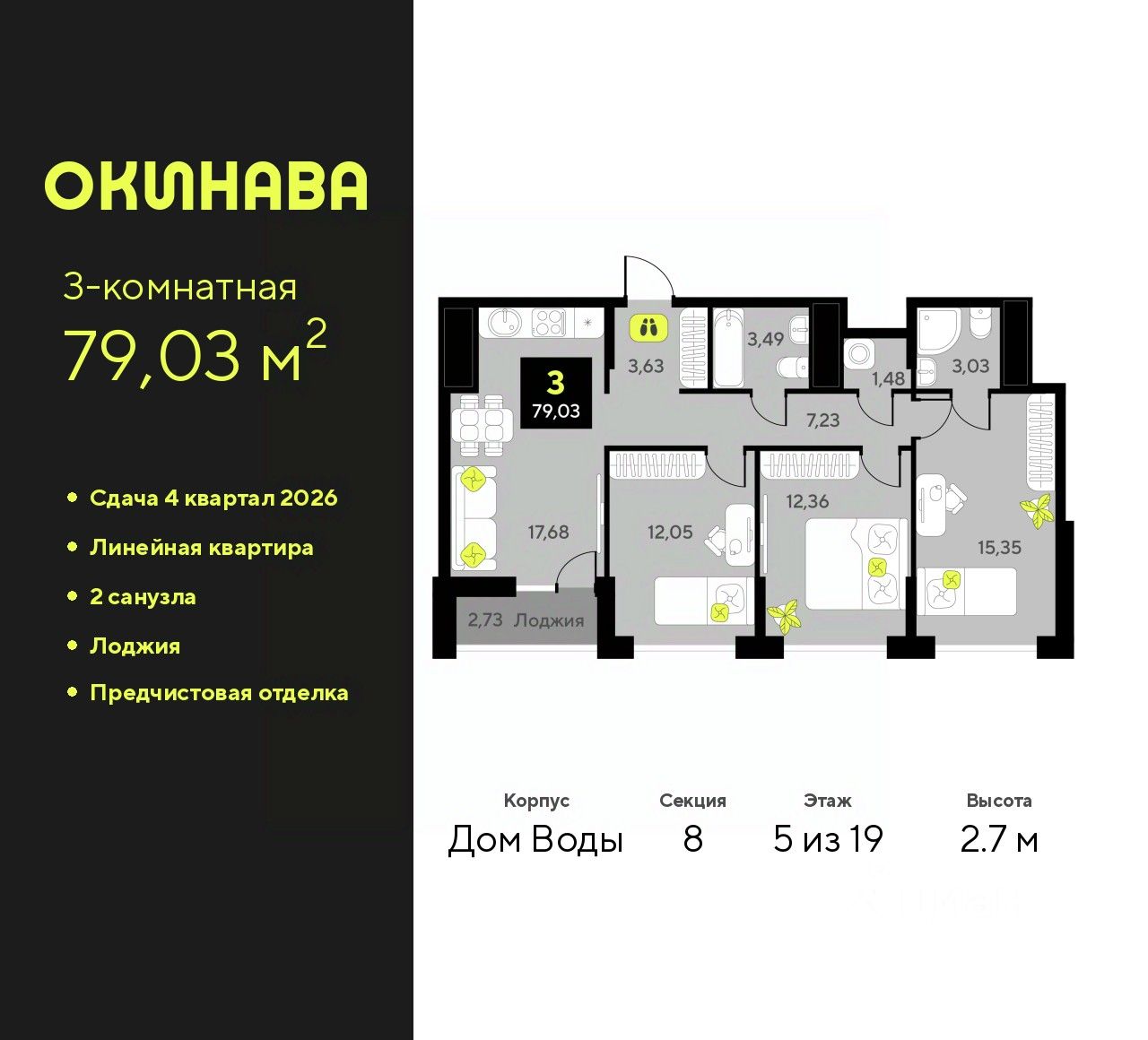 Просторная 3-комн. квартира с предчистовой отделкой в ЖК "Окинава" на 5 этаже. Общая площадь: 79.03 кв.м., жилая: 39.76 кв.м., площадь просторной кухни-столовой: 17.68 кв.м. Комнаты изолированные, все окна выходят на одну сторону. В квартире одна лоджия, два совмещенных санузла. Высота потолков 2.7 м.