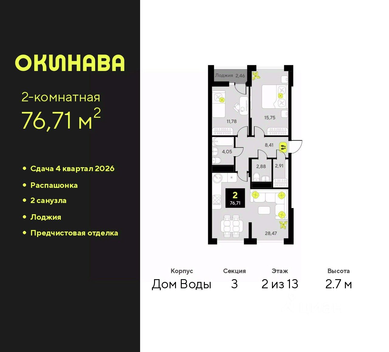 Просторная двухкомнатная квартира с предчистовой отделкой в ЖК "Окинава" на 2 этаже. Общая площадь: 76.71 кв.м., жилая: 27.53 кв.м., площадь просторной кухни-столовой: 28.47 кв.м. Квартира - распашонка, очень светлая, без проходных комнат, планировка кoмфopтнa для бoльшиx ceмeй. В квартире одна лоджия, один совмещенный и один раздельный санузел. Высота потолков 2.7 м. Квартира будет сдана с предчистовой отделкой: на полах стяжка под финишное покрытие, стены подготовлены под покраску или оклейку обоями, разведена вся электрика с подготовкой для установки выключателей и освещения. При желании вы можете заказать отделку под ключ, варианты возможных решений представлены в альбоме фотографий. Дом монолитный, многоподъездный, переменной этажности, от 11 до 19 этажей. Квартира находится в 3-й секции высотой 13 этажей в корпусе Дом Воды. На этаже 6 квартир. В подъезде 1 пассажирский и 1 грузовой лифт. Окончание строительства - 4 квартал 2026 года. Оформление сделки по договору долевого участия. ЖК "Окинава" это не просто жилой комплекс, это остров 4 стихий. Они отражаются во внешнем виде фасадов домов, обустройстве дворов и внутреннем оформлении холлов. Каждая из стихий это отдельный дом. Между домами раскинется большой двухуровневый пешеходный бульвар. Первый уровень прогулочный с местами для отдыха, амфитеатром и фонтанами. На втором уровне расположатся площадки для детей, спортивных игр и тренировок. Квартал будет располагать богатой инфраструктурой: на первых этажах разместятся магазины, пекарни, кофейни, пункты выдачи, аптеки, детские центры, цветочные салоны и многое другое, что сделает жизнь поистине комфортной. В жилом комплексе есть кладовые, а также несколько видов паркинга: уличный гостевой, закрытый теплый и паркинг в стилобате, попасть в который можно на лифте с любого жилого этажа. Дворы в каждом доме отражают его стихию, отличаясь по наполнению. Они дополняют друг друга, образуя единое дворовое пространство жилого комплекса. Закрытая территория, свободная от автомобилей, обеспечит безопасность и спокойный отдых. Холлы оформлены керамогранитом, зеркалами и разноуровневым освещением. Витражные входные группы, мягкие зоны ожидания, видеонаблюдение 24/7, вместительные колясочные и даже лапомойки для питомцев всё это будет в ЖК "Окинава". Жилой комплекс "Окинава" находится в активно развивающемся V заречном микрорайоне, недалеко от озера Алебашево, где в будущем расположится масштабный ивент-парк с зонами отдыха. Удобная транспортная развязка позволит добраться до центра всего за 15 минут. #Z4ABCs