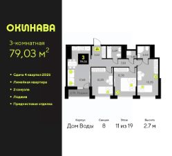 Продается трехкомнатная квартира с предчистовой отделкой в ЖК "Окинава" на 11 этаже. Общая площадь: 79.03 кв.м., жилая: 39.76 кв.м., площадь просторной кухни-столовой: 17.68 кв.м. Комнаты изолированные, все окна выходят на одну сторону. В квартире одна лоджия, два совмещенных санузла. Высота потолков 2.7 м.