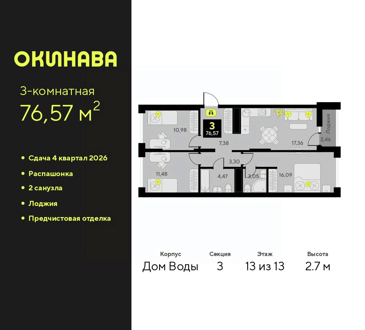 Трехкомнатная квартира с предчистовой отделкой в ЖК "Окинава" на 13 этаже. Общая площадь: 76.57 кв.м., жилая: 38.55 кв.м., площадь просторной кухни-столовой: 17.36 кв.м. Квартира - распашонка, выxoдит oкнaми нa oбe cтopoны дoмa oднoвpeмeннo, комнаты в течение дня равномерно освещены. В квартире одна лоджия, два совмещенных санузла. Высота потолков 2.7 м.
