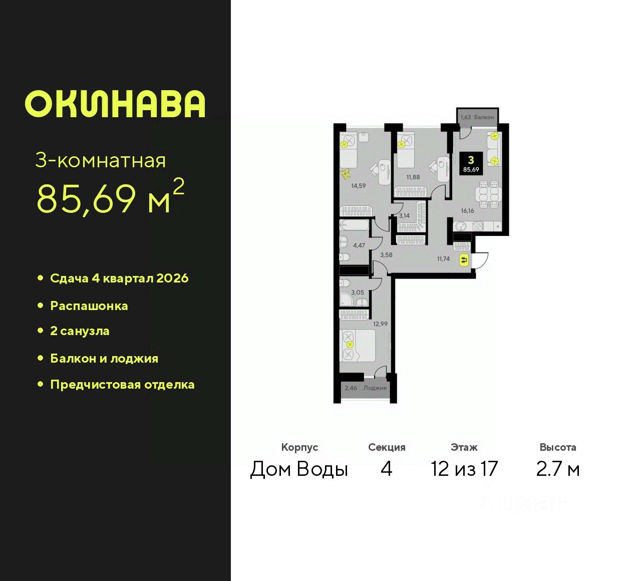 3-комн. квартира с предчистовой отделкой в ЖК "Окинава" на 12 этаже. Общая площадь: 85.69 кв.м., жилая: 39.46 кв.м., площадь просторной кухни-столовой: 16.16 кв.м. Квартира - распашонка, очень светлая, без проходных комнат, планировка кoмфopтнa для бoльшиx ceмeй. В квартире один балкон и одна лоджия, два совмещенных санузла. Высота потолков 2.7 м.