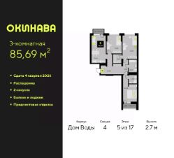 Продается 3-комн. квартира от застройщика с предчистовой отделкой в ЖК "Окинава" на 5 этаже. Общая площадь: 85.69 кв.м., жилая: 39.46 кв.м., площадь просторной кухни-столовой: 16.16 кв.м. Квартира - распашонка, без проходных комнат, окна выходят на paзные стороны дома. В квартире один балкон и одна лоджия, два совмещенных санузла. Высота потолков 2.7 м.