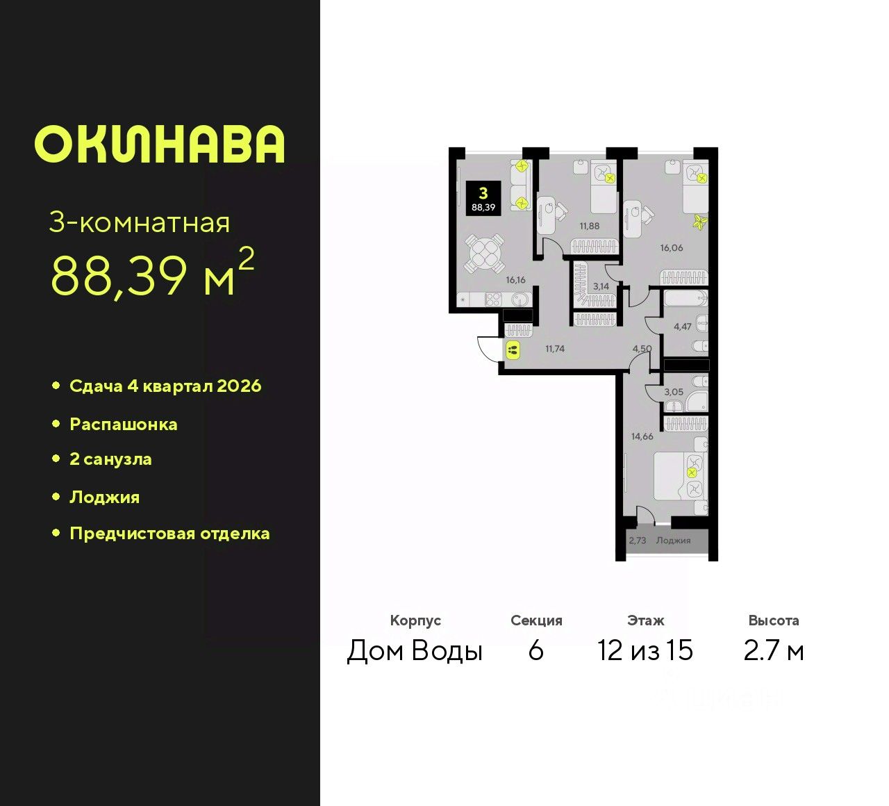 Продается трехкомнатная квартира с предчистовой отделкой в ЖК "Окинава" на 12 этаже. Общая площадь: 88.39 кв.м., жилая: 42.6 кв.м., площадь просторной кухни-столовой: 16.16 кв.м. Квартира - распашонка, без проходных комнат, окна выходят на paзные стороны дома. В квартире одна лоджия, два совмещенных санузла. Высота потолков 2.7 м.