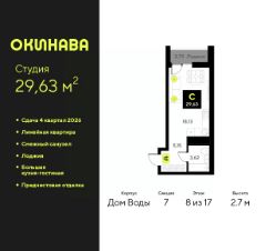 1-комн. квартира-студия с предчистовой отделкой в ЖК "Окинава" на 8 этаже. Общая площадь: 29.63 кв.м., площадь гостиной 18.13 кв.м., из которых 5 кв.м. выделено под кухонную зону. Все окна выходят на одну сторону. В квартире одна лоджия, один совмещенный санузел. Высота потолков 2.7 м.