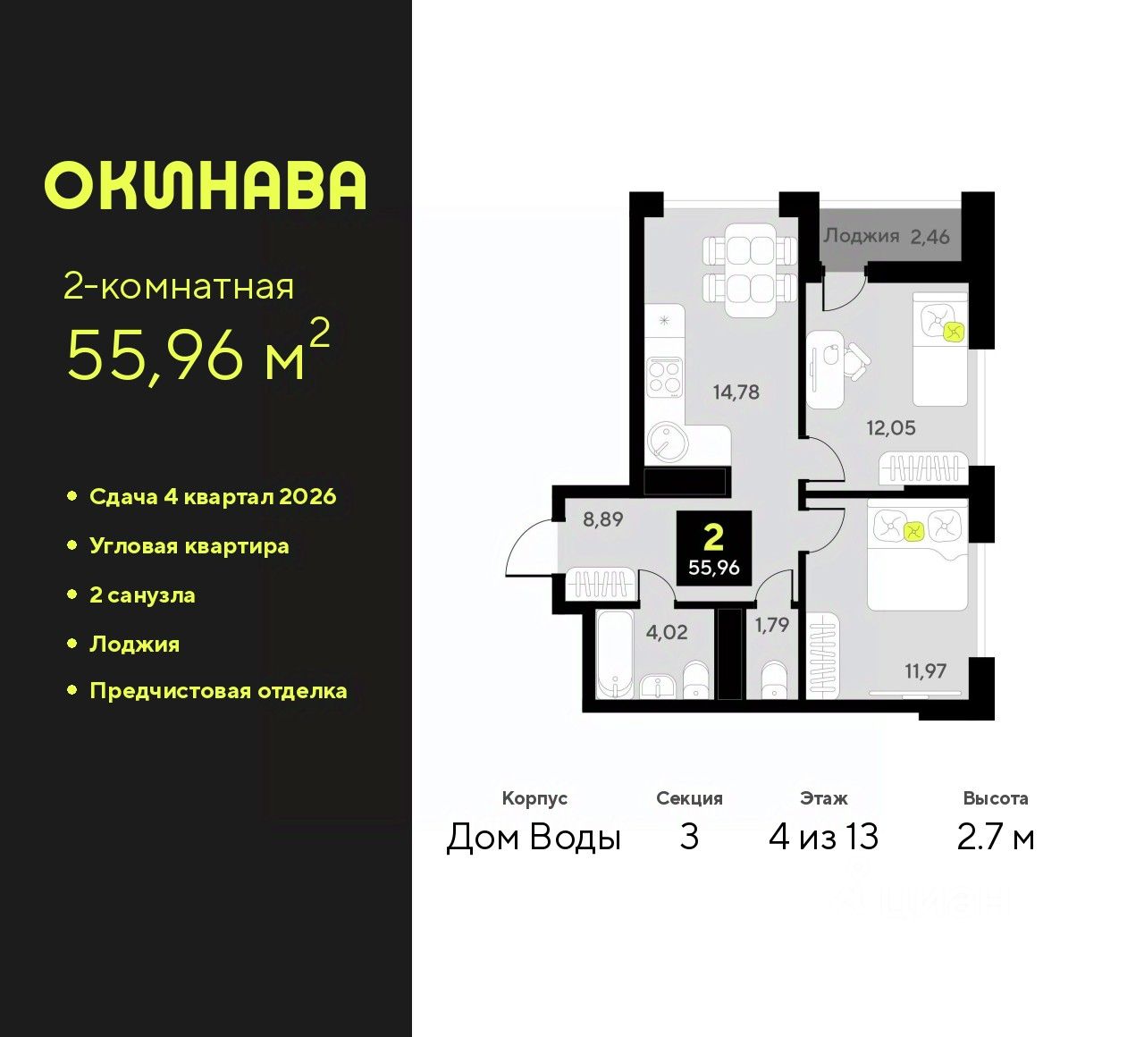 2-комн. квартира с предчистовой отделкой в ЖК "Окинава" на 4 этаже. Общая площадь: 55.96 кв.м., жилая: 24.02 кв.м., площадь просторной кухни-столовой: 14.78 кв.м. Угловая квартира, очень светлая, естественная вентиляция при открытии окон. В квартире одна лоджия, один совмещенный и один раздельный санузел. Высота потолков 2.7 м.