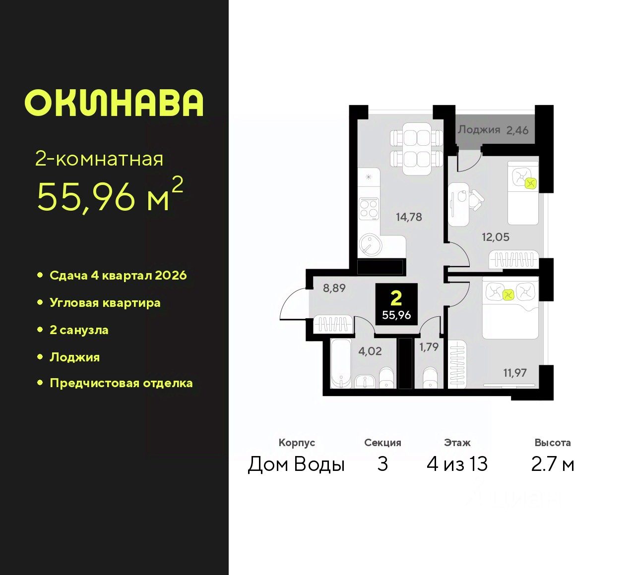 2-комн. квартира с предчистовой отделкой в ЖК "Окинава" на 4 этаже. Общая площадь: 55.96 кв.м., жилая: 24.02 кв.м., площадь просторной кухни-столовой: 14.78 кв.м. Квартира угловая, очень светлая, естественная вентиляция при открытии окон. В квартире одна лоджия, один совмещенный и один раздельный санузел. Высота потолков 2.7 м.
