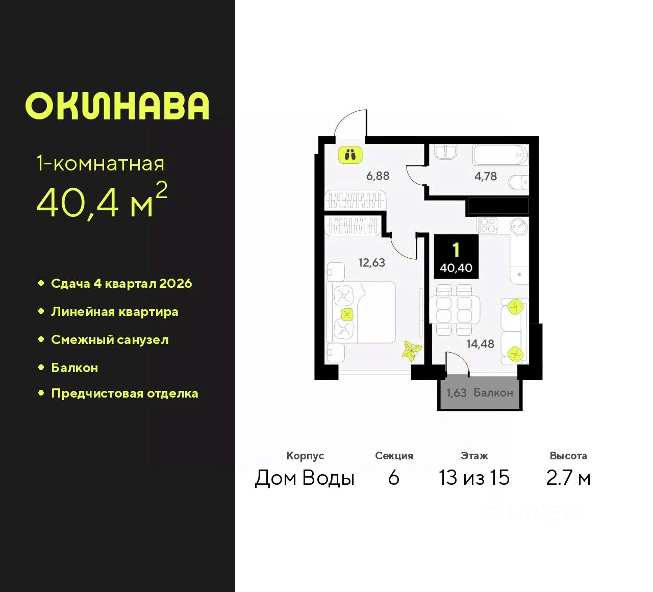 Просторная 1-комн. квартира с предчистовой отделкой в ЖК "Окинава" на 13 этаже. Общая площадь: 40.4 кв.м., жилая: 12.63 кв.м., площадь просторной кухни-столовой: 14.48 кв.м. Все окна выходят на одну сторону. В квартире один балкон, один совмещенный санузел. Высота потолков 2.7 м.