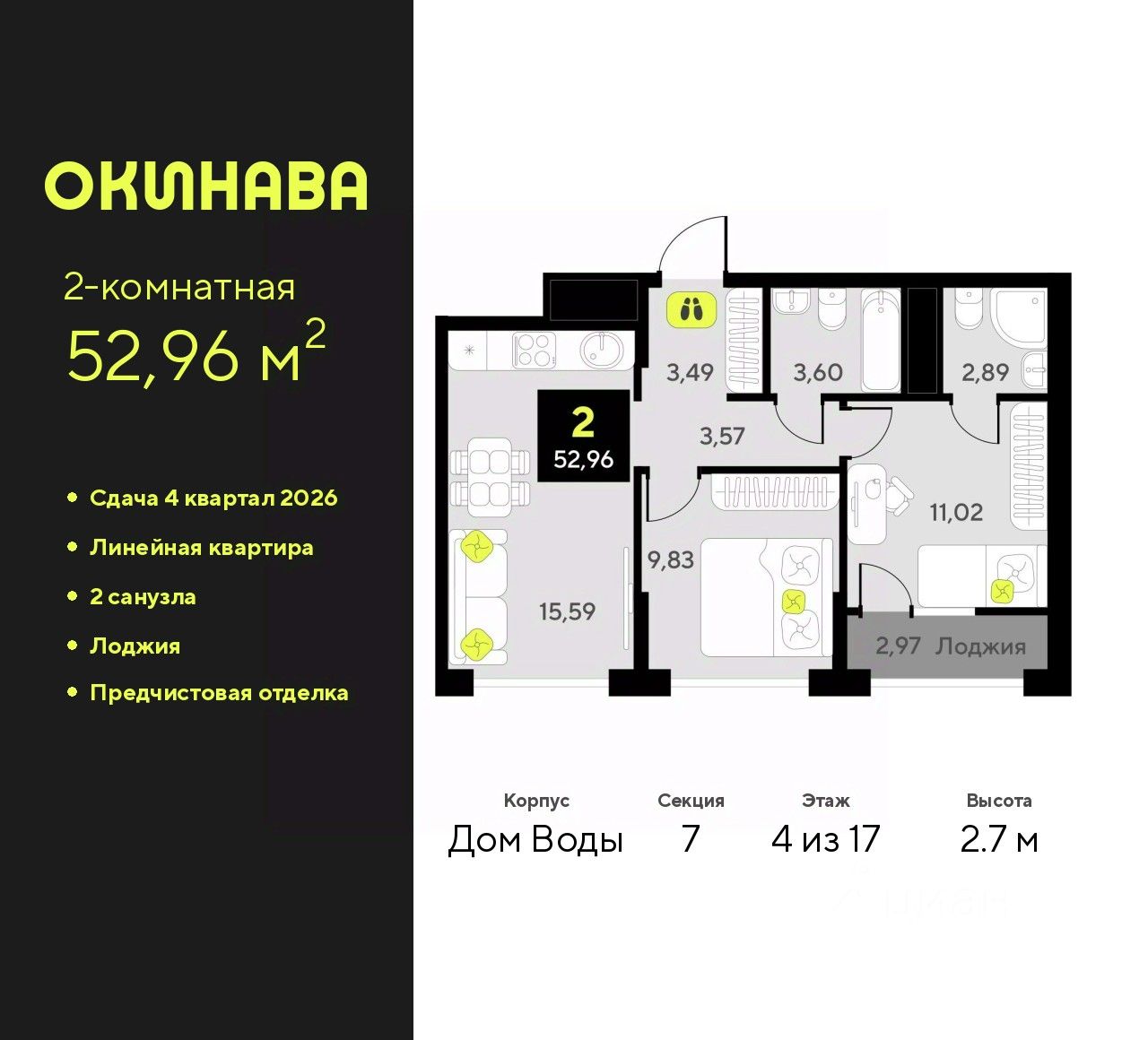 Просторная 2-комн. квартира с предчистовой отделкой в ЖК "Окинава" на 4 этаже. Общая площадь: 52.96 кв.м., жилая: 20.85 кв.м., площадь просторной кухни-столовой: 15.59 кв.м. Комнаты изолированные, все окна выходят на одну сторону. В квартире одна лоджия, два совмещенных санузла. Высота потолков 2.7 м.