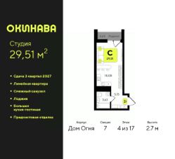 Продается 1-комн. квартира-студия с предчистовой отделкой в ЖК "Окинава" на 4 этаже. Общая площадь: 29.51 кв.м., площадь гостиной 18.08 кв.м., из которых 5 кв.м. выделено под кухонную зону. Все окна выходят на одну сторону. В квартире одна лоджия, один совмещенный санузел. Высота потолков 2.7 м.