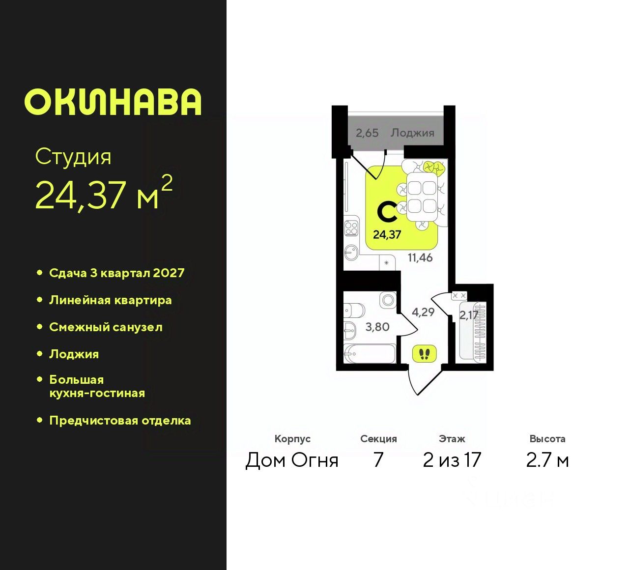 Продается 1-комн. квартира-студия с предчистовой отделкой в ЖК "Окинава" на 2 этаже. Общая площадь: 24.37 кв.м., площадь гостиной 11.46 кв.м., из которых 5 кв.м. выделено под кухонную зону. Все окна выходят на одну сторону. В квартире одна лоджия, один совмещенный санузел. Высота потолков 2.7 м.