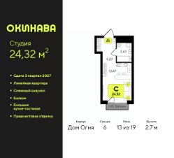 Просторная однокомнатная квартира-студия с предчистовой отделкой в ЖК "Окинава" на 13 этаже. Общая площадь: 24.32 кв.м., площадь гостиной 13.67 кв.м., из которых 5 кв.м. выделено под кухонную зону. Все окна выходят на одну сторону. В квартире один балкон, один совмещенный санузел. Высота потолков 2.7 м.