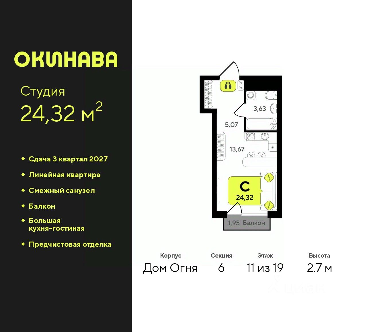 Продается 1-комн. квартира-студия с предчистовой отделкой в ЖК "Окинава" на 11 этаже. Общая площадь: 24.32 кв.м., площадь гостиной 13.67 кв.м., из которых 5 кв.м. выделено под кухонную зону. Все окна выходят на одну сторону. В квартире один балкон, один совмещенный санузел. Высота потолков 2.7 м.