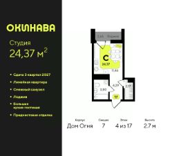 Однокомнатная квартира-студия от застройщика с предчистовой отделкой в ЖК "Окинава" на 4 этаже. Общая площадь: 24.37 кв.м., площадь гостиной 11.46 кв.м., из которых 5 кв.м. выделено под кухонную зону. Все окна выходят на одну сторону. В квартире одна лоджия, один совмещенный санузел. Высота потолков 2.7 м.