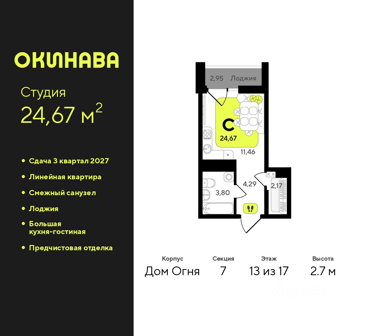 Однокомнатная квартира-студия с предчистовой отделкой в ЖК "Окинава" на 13 этаже. Общая площадь: 24.67 кв.м., площадь гостиной 11.46 кв.м., из которых 5 кв.м. выделено под кухонную зону. Все окна выходят на одну сторону. В квартире одна лоджия, один совмещенный санузел. Высота потолков 2.7 м.