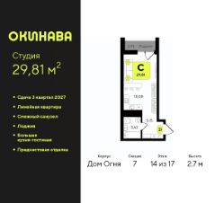 1-комн. квартира-студия с предчистовой отделкой в ЖК "Окинава" на 14 этаже. Общая площадь: 29.81 кв.м., площадь гостиной 18.08 кв.м., из которых 5 кв.м. выделено под кухонную зону. Все окна выходят на одну сторону. В квартире одна лоджия, один совмещенный санузел. Высота потолков 2.7 м.