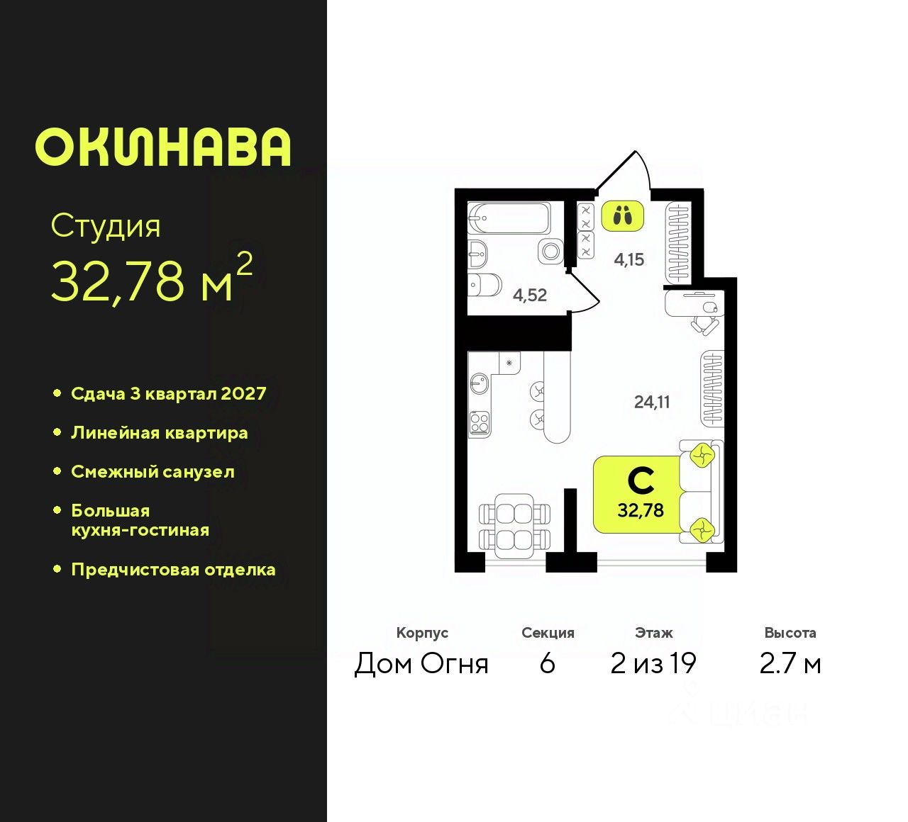 Просторная 1-комн. квартира-студия с предчистовой отделкой в ЖК "Окинава" на 2 этаже. Общая площадь: 32.78 кв.м., площадь гостиной 24.11 кв.м., из которых 5 кв.м. выделено под кухонную зону. Все окна выходят на одну сторону. В квартире один совмещенный санузел. Высота потолков 2.7 м.