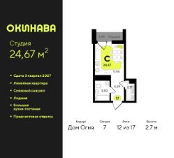 Продается однокомнатная квартира-студия от застройщика с предчистовой отделкой в ЖК "Окинава" на 12 этаже. Общая площадь: 24.67 кв.м., площадь гостиной 11.46 кв.м., из которых 5 кв.м. выделено под кухонную зону. Все окна выходят на одну сторону. В квартире одна лоджия, один совмещенный санузел. Высота потолков 2.7 м.