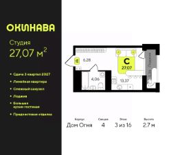 Продается однокомнатная квартира-студия от застройщика с предчистовой отделкой в ЖК "Окинава" на 3 этаже. Общая площадь: 27.07 кв.м., площадь гостиной 13.37 кв.м., из которых 5 кв.м. выделено под кухонную зону. Все окна выходят на одну сторону. В квартире одна лоджия, один совмещенный санузел. Высота потолков 2.7 м.