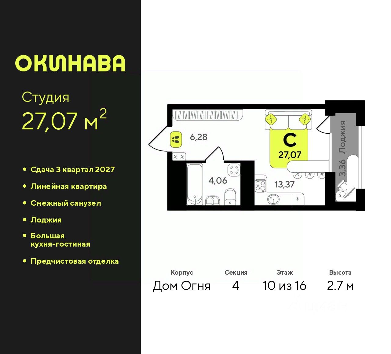 1-комн. квартира-студия с предчистовой отделкой в ЖК "Окинава" на 10 этаже. Общая площадь: 27.07 кв.м., площадь гостиной 13.37 кв.м., из которых 5 кв.м. выделено под кухонную зону. Все окна выходят на одну сторону. В квартире одна лоджия, один совмещенный санузел. Высота потолков 2.7 м.