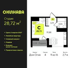 Просторная однокомнатная квартира-студия с предчистовой отделкой в ЖК "Окинава" на 11 этаже. Общая площадь: 28.72 кв.м., площадь гостиной 19.88 кв.м., из которых 5 кв.м. выделено под кухонную зону. Все окна выходят на одну сторону. В квартире одна лоджия, один совмещенный санузел. Высота потолков 2.7 м.