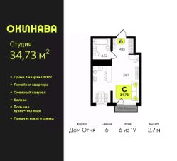 1-комн. квартира-студия с предчистовой отделкой в ЖК "Окинава" на 6 этаже. Общая площадь: 34.73 кв.м., площадь гостиной 24.11 кв.м., из которых 5 кв.м. выделено под кухонную зону. Все окна выходят на одну сторону. В квартире один балкон, один совмещенный санузел. Высота потолков 2.7 м.