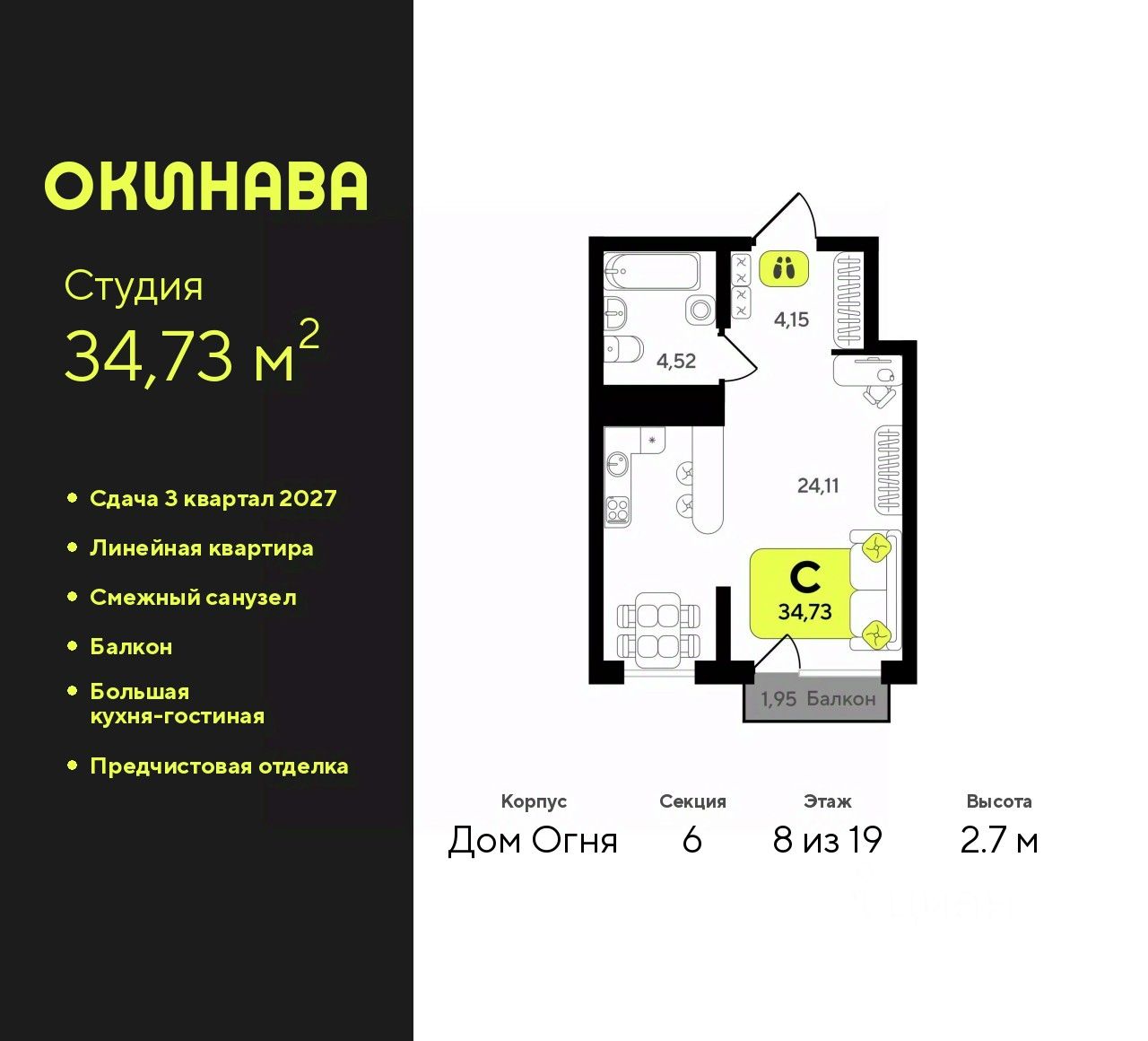 Просторная 1-комн. квартира-студия с предчистовой отделкой в ЖК "Окинава" на 8 этаже. Общая площадь: 34.73 кв.м., площадь гостиной 24.11 кв.м., из которых 5 кв.м. выделено под кухонную зону. Все окна выходят на одну сторону. В квартире один балкон, один совмещенный санузел. Высота потолков 2.7 м.