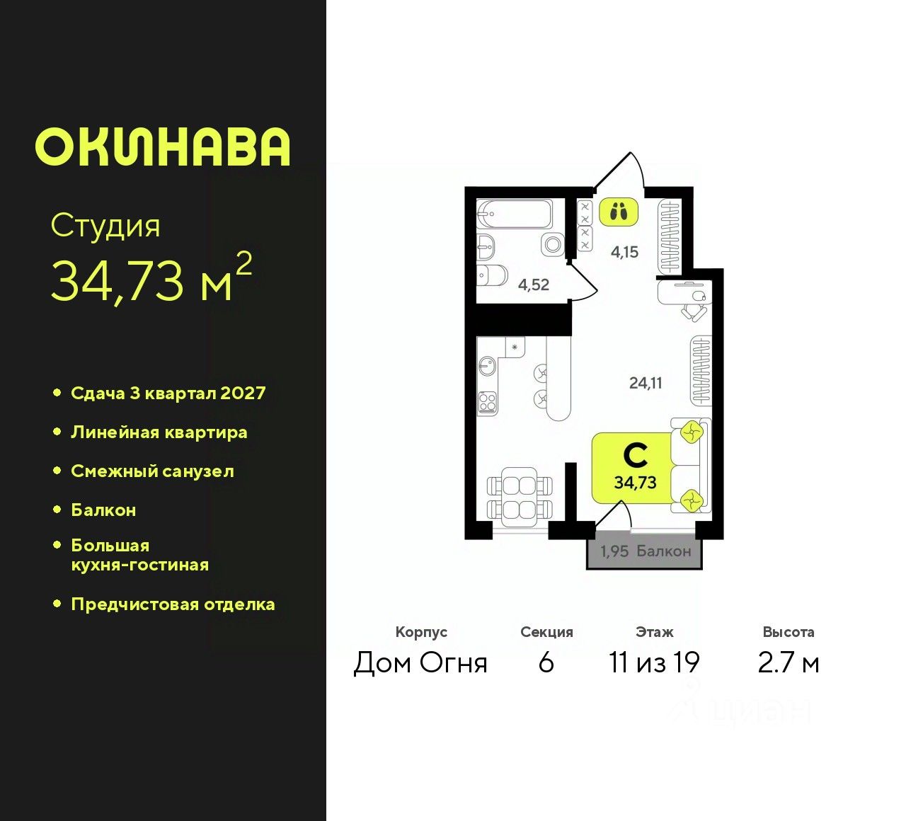 Однокомнатная квартира-студия от застройщика с предчистовой отделкой в ЖК "Окинава" на 11 этаже. Общая площадь: 34.73 кв.м., площадь гостиной 24.11 кв.м., из которых 5 кв.м. выделено под кухонную зону. Все окна выходят на одну сторону. В квартире один балкон, один совмещенный санузел. Высота потолков 2.7 м.