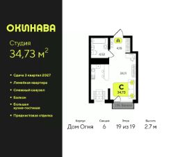 1-комн. квартира-студия с предчистовой отделкой в ЖК "Окинава" на 19 этаже. Общая площадь: 34.73 кв.м., площадь гостиной 24.11 кв.м., из которых 5 кв.м. выделено под кухонную зону. Все окна выходят на одну сторону. В квартире один балкон, один совмещенный санузел. Высота потолков 2.7 м.