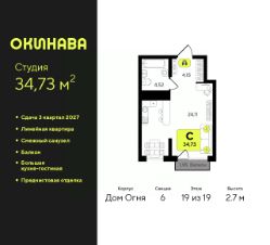 Продается 1-комн. квартира-студия с предчистовой отделкой в ЖК "Окинава" на 19 этаже. Общая площадь: 34.73 кв.м., площадь гостиной 24.11 кв.м., из которых 5 кв.м. выделено под кухонную зону. Все окна выходят на одну сторону. В квартире один балкон, один совмещенный санузел. Высота потолков 2.7 м.