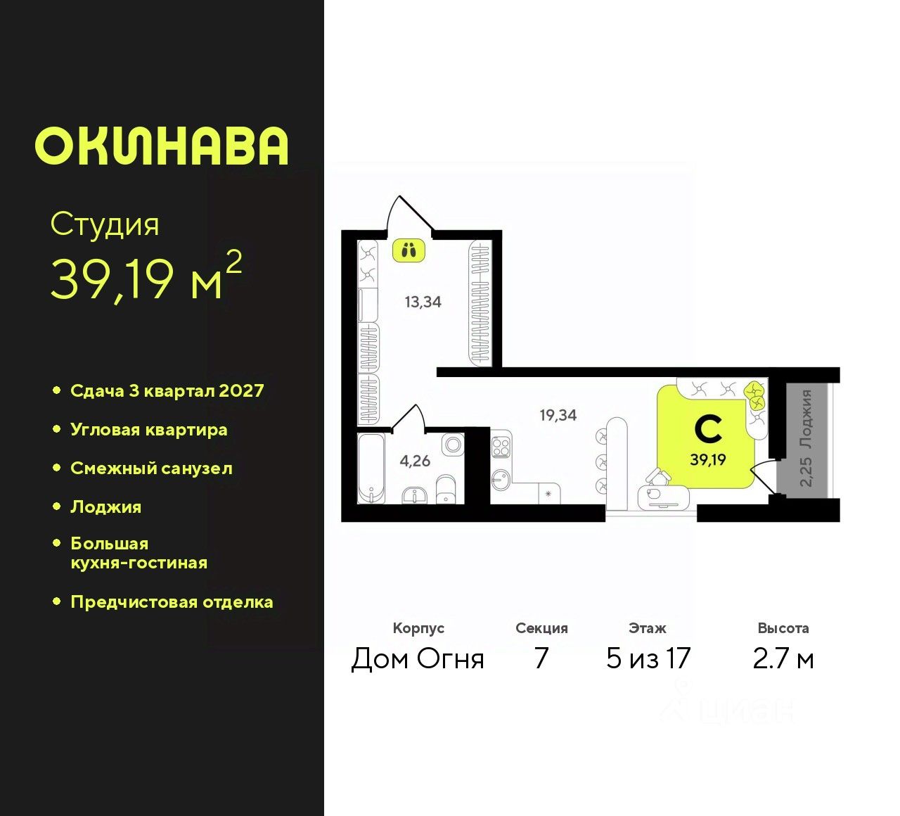 Однокомнатная квартира-студия с предчистовой отделкой в ЖК "Окинава" на 5 этаже. Общая площадь: 39.19 кв.м., площадь гостиной 19.34 кв.м., из которых 5 кв.м. выделено под кухонную зону. Квартира угловая, очень светлая, естественная вентиляция при открытии окон. В квартире одна лоджия, один совмещенный санузел. Высота потолков 2.7 м.